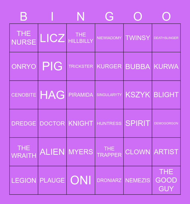 This bingo card has 36 words: THE TRAPPER, MYERS, DRONIARZ, ONRYO, DREDGE, SINGULARYTY, PIG, ONI, TWINSY, CLOWN, KURWA, NIEWIADOMY, ARTIST, HAG, KURGER, THE NURSE, THE WRAITH, KSZYK, CENOBITE, THE HILLBILLY, PIRAMIDA, DOCTOR, HUNTRESS, KNIGHT, SPIRIT, LICZ, BUBBA, PLAUGE, TRICKSTER, DEATHSLINGER, THE GOOD GUY, LEGION, DEMOGORGON, BLIGHT, ALIEN and NEMEZIS.