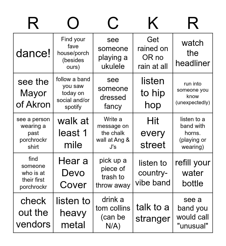 This bingo card has a free space and 24 words: Hear a Devo Cover, listen to heavy metal, see someone dressed fancy, check out the vendors, watch the headliner, dance!, see the Mayor of Akron, Find your fave house/porch (besides ours), Hit every street, pick up a piece of trash to throw away, listen to hip hop, see a person wearing a past porchrockr shirt, listen to country-vibe band, refill your water bottle, follow a band you saw today on social and/or spotify, talk to a stranger, listen to a band with horns. (playing or wearing), see someone playing a ukulele, run into someone you know (unexpectedly), walk at least 1 mile, see a band you would call "unusual", find someone who is at their first porchrockr, Get rained on OR no rain at all and drink a tom collins (can be N/A).