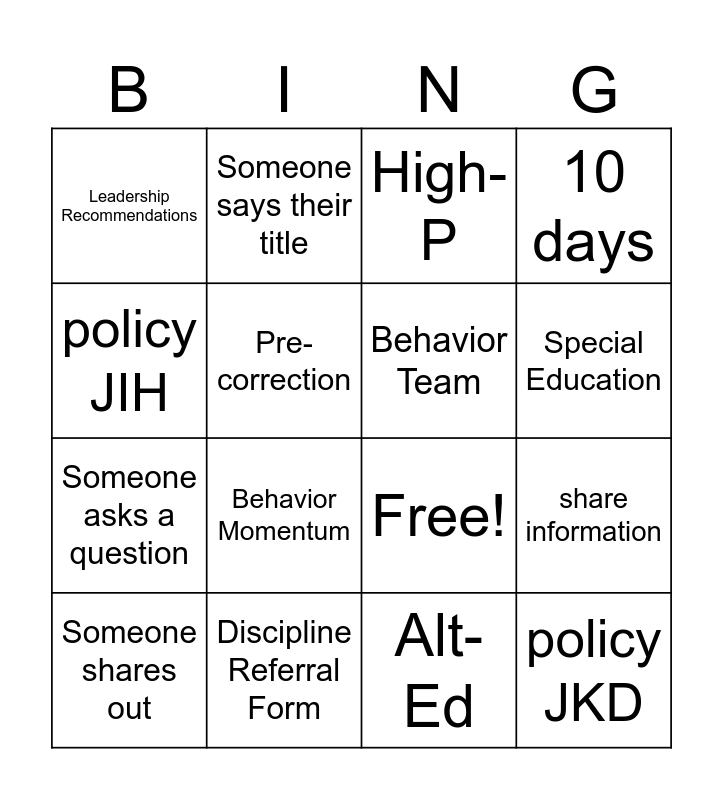 This bingo card has 19 words: Free!, CICO, High-P, policy JKD, share information, policy JIH, Alt-Ed, Leadership Recommendations, Someone says their title, Someone asks a question, Behavior Momentum, Pre-correction, Behavior Team, Discipline Referral Form, Someone shares out, You introduces yourself to someone you don't know, 10 days, Special Education and cell phone.