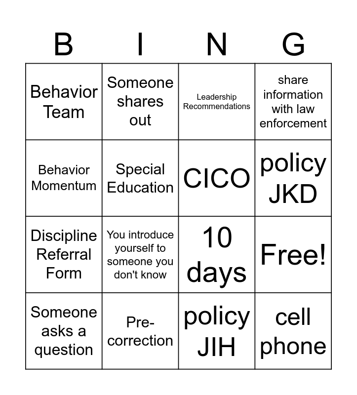 This bingo card has 20 words: Free!, Alt-Ed, Leadership Recommendations, Someone says their title, Someone asks a question, Behavior Momentum, Pre-correction, Behavior Team, Discipline Referral Form, Someone shares out, You introduce yourself to someone you don't know, 10 days, Special Education, cell phone, CICO, High-P, policy JKD, share information with law enforcement, policy JIH and District Supports.