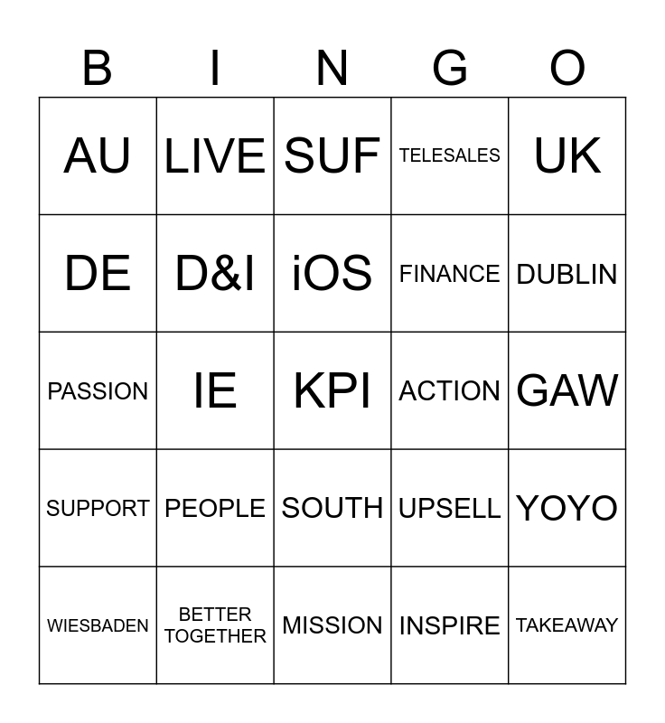 This bingo card has a free space and 64 words: PACO, GMB, OYY, YOYO, POS, RP, LIVE, KYC, iOS, NORTH, SOUTH, No1, GAW, UK, DK, DE, IE, AU, TECH, FINANCE, PEOPLE, SUPPORT, TELESALES, FIELD SALES, ONBOARDING, CUSTOMER SUCCESS, IT, ORDERYOYO, JESPER J, JESPER H, KRISTIAN, RALF, MANCHESTER, COPENHAGEN, DUBLIN, WIESBADEN, EMPOWER, INSPIRE, LIBERATE, D&I, PASSION, ACTION, COMPASSION, ONE TEAM, LOCAL, TAKEAWAY, BETTER TOGETHER, FLYERS, UPSELL, QR CODE, GREEN WEEKS, L28, MISSION, COMMITMENT, ONLINE, FB, SUF, CONFERENCE, TECH SUMMIT, INSTALL, CONTROL, LOYALTY, DEVELOPMENT and MAKE IT HAPPEN.