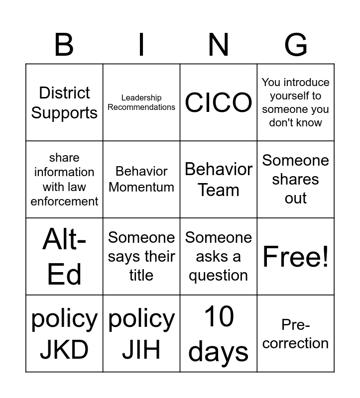 This bingo card has 20 words: Free!, cell phone, CICO, High-P, policy JKD, share information with law enforcement, policy JIH, District Supports, Alt-Ed, Leadership Recommendations, Someone says their title, Someone asks a question, Behavior Momentum, Pre-correction, Behavior Team, Discipline Referral Form, Someone shares out, You introduce yourself to someone you don't know, 10 days and Special Education.