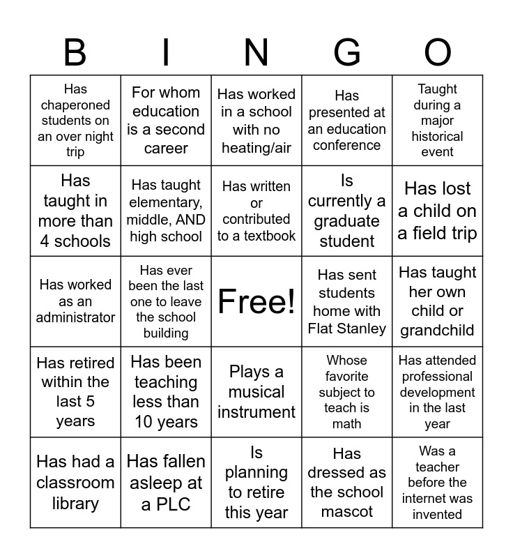 This bingo card has a free space and 35 words: Educator for 30+ years, Has been a mentor to a student teacher, Had a class pet named after a famous person, Has taught elementary, middle, AND high school, Plays a musical instrument, Has presented at an education conference, Has taught in more than 4 schools, Has taught in another country, Has written or contributed to a textbook, Has received a teaching award, Has worked as an administrator, Taught during a major historical event, Has taught multiple generations of the same family, Has been a drama club advisor, Has chaperoned students on an over night trip, Has sent students home with Flat Stanley, Has dressed as the school mascot, Has ever been the last one to leave the school building, Has retired within the last 5 years, Was a teacher before the internet was invented, Whose favorite subject to teach is math, Has had a classroom library, Has attended professional development in the last year, Has fallen asleep at a PLC, Has worked in a school with no heating/air, Has lost a child on a field trip, Has forgotten about a spirit day or school event, Has served as yearbook advisor, Is currently a graduate student, Has taught her own child or grandchild, Has taught in a portable, Is planning to retire this year, Has been teaching less than 10 years, For whom education is a second career and Who has seen a student in public but forgotten their name.