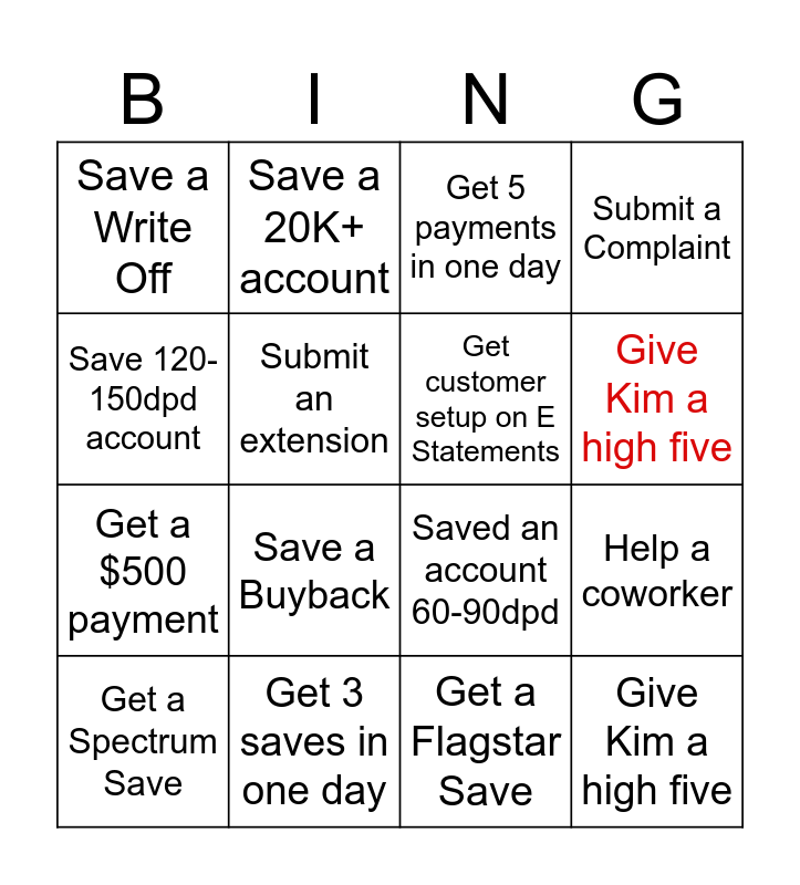 This bingo card has 17 words: Get a Flagstar Save, Get a Spectrum Save, Get 5 payments in one day, Save a Write Off, Save a Buyback, Submit a Complaint, Help a coworker, Get customer setup on E Statements, Give Kim a high five, Submit an extension, Get 3 saves in one day, Saved an account 60-90dpd, Save 120-150dpd account, Save a 20K+ account, Get a $500 payment, Collect $2,000 in payments in a day and Give Kim a high five.