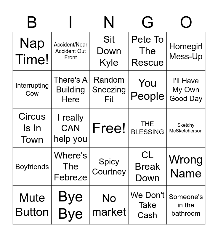 This bingo card has a free space and 34 words: Hannah Gives Mom Look, We Don't Take Cash, Where Are The Crayons, Day Ruined, Boyfriends, There's A Building Here, Homegirl Mess-Up, Mute Button, Accident/Near Accident Out Front, Random Renee/Sharon Noise, Random Sneezing Fit, Sit Down Kyle, Left The Conversation, Mama Hannah's Here, THE BLESSING, I'll Have My Own Good Day, Bye Bye, Circus Is In Town, Where's The Febreze, CL Break Down, Spicy Courtney, Submits quote, calls right away..., Nap Time!, Sketchy McSketcherson, No market, Someone's in the bathroom, Pete To The Rescue, You're Done, You People, Interrupting Cow, Oh God, here comes Kyle, I really CAN help you, Wrong Name and Cool Car Bro.