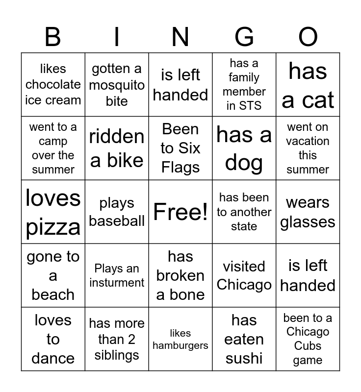 This bingo card has a free space and 24 words: Plays an insturment, has more than 2 siblings, Been to Six Flags, loves to dance, has a cat, likes chocolate ice cream, went to a camp over the summer, gotten a mosquito bite, has been to another state, has broken a bone, has a dog, loves pizza, visited Chicago, is left handed, ridden a bike, has eaten sushi, wears glasses, is left handed, went on vacation this summer, plays baseball, been to a Chicago Cubs game, gone to a beach, has a family member in STS and likes hamburgers.