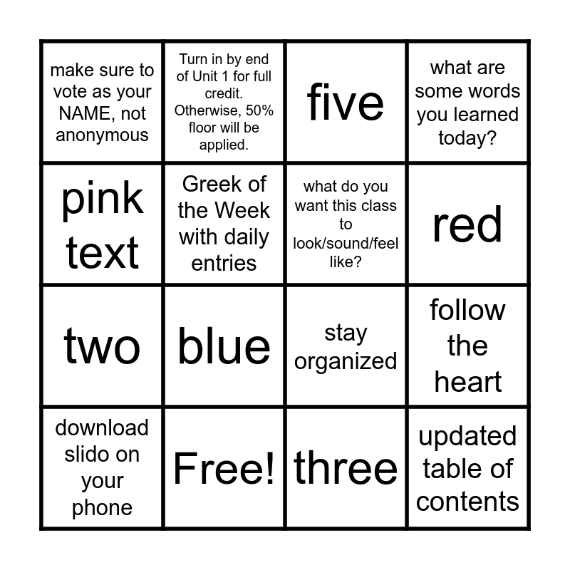 This bingo card has 24 words: Follow the star, "Start here" folder, red, 4th column in the course calendar, pink text, make sure to vote as your NAME, not anonymous, Greek of the Week with daily entries, Turn in by end of Unit 1 for full credit. Otherwise, 50% floor will be applied., Free!, Missing after due date. 50% floor applied, two, stay organized, 3rd column in the course calendar, Take-Away Question, what do you want this class to look/sound/feel like?, Unit 1 folder --> Week 2 folder, three, five, blue, follow the heart, download slido on your phone, updated table of contents, what are some words you learned today? and "Support for your Science Notebook" folder.