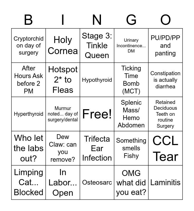 This bingo card has a free space and 24 words: Dew Claw: can you remove?, In Labor... Open, Hypothyroid, Limping Cat... Blocked, PU/PD/PP and panting, Cryptorchid on day of surgery, After Hours Ask before 2 PM, Holy Cornea, Splenic Mass/ Hemo Abdomen, Trifecta Ear Infection, Ticking Time Bomb (MCT), Hyperthyroid, Something smells Fishy, CCL Tear, Hotspot 2* to Fleas, OMG what did you eat?, Retained Deciduous Teeth on routine Surgery, Stage 3: Tinkle Queen, Constipation is actually diarrhea, Murmur noted... day of surgery/dental, Laminitis, Who let the labs out?, Urinary Incontinence... DM and Osteosarc.