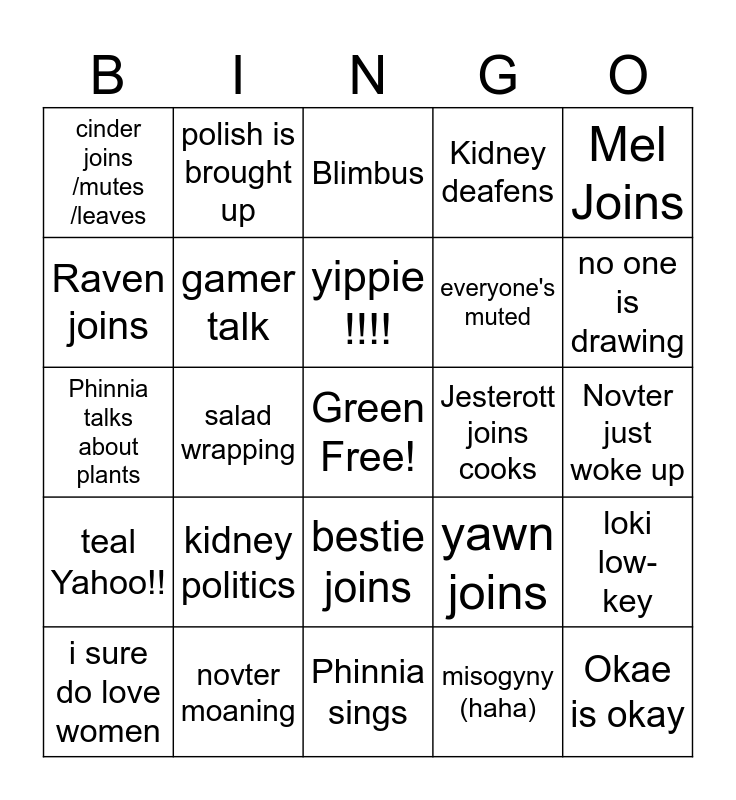 This bingo card has a free space and 35 words: green & persona, NovNey ❤, Critique Hangout mentioned, gamer talk, bestie joins, Kidney deafens, Raven joins, novter heeyah~, yippie !!!!, too tired to draw, Phinnia talks about plants, Mel Joins, Men drawn, Twitter Shadow ban, cinder joins /mutes /leaves, Jesterott joins cooks, misogyny (haha), salad wrapping, teal Yahoo!!, Okae is okay, yawn joins, i sure do love women, loki low-key, novter moaning, Blimbus, no one is drawing, no drawer, streaming a game, everyone's muted, Novter just woke up, nswf drawn, Phinnia sings, kidney politics, polish is brought up and Zelly joins.