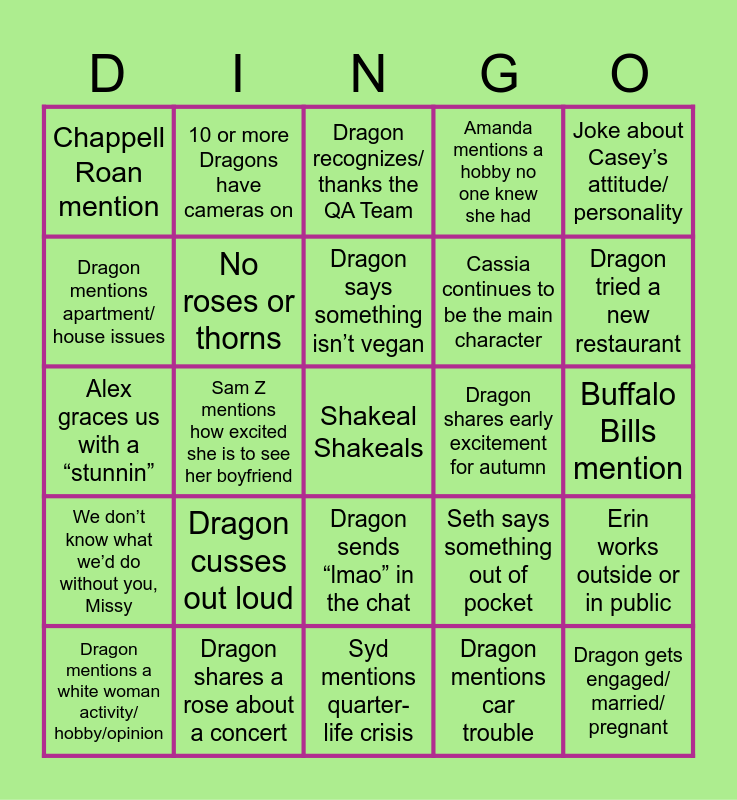 This bingo card has a free space and 24 words: Dragon cusses out loud, Dragon shares a rose about a concert, Dragon says something isn’t vegan, Dragon mentions a white woman activity/ hobby/opinion, Joke about Casey’s attitude/ personality, Chappell Roan mention, Dragon mentions apartment/ house issues, 10 or more Dragons have cameras on, Dragon shares early excitement for autumn, Dragon sends “lmao” in the chat, Cassia continues to be the main character, Alex graces us with a “stunnin”, Seth says something out of pocket, Erin works outside or in public, No roses or thorns, Dragon mentions car trouble, Buffalo Bills mention, Dragon recognizes/ thanks the QA Team, Dragon tried a new restaurant, Sam Z mentions how excited she is to see her boyfriend, Dragon gets engaged/ married/ pregnant, We don’t know what we’d do without you, Missy, Amanda mentions a hobby no one knew she had and Syd mentions quarter-life crisis.
