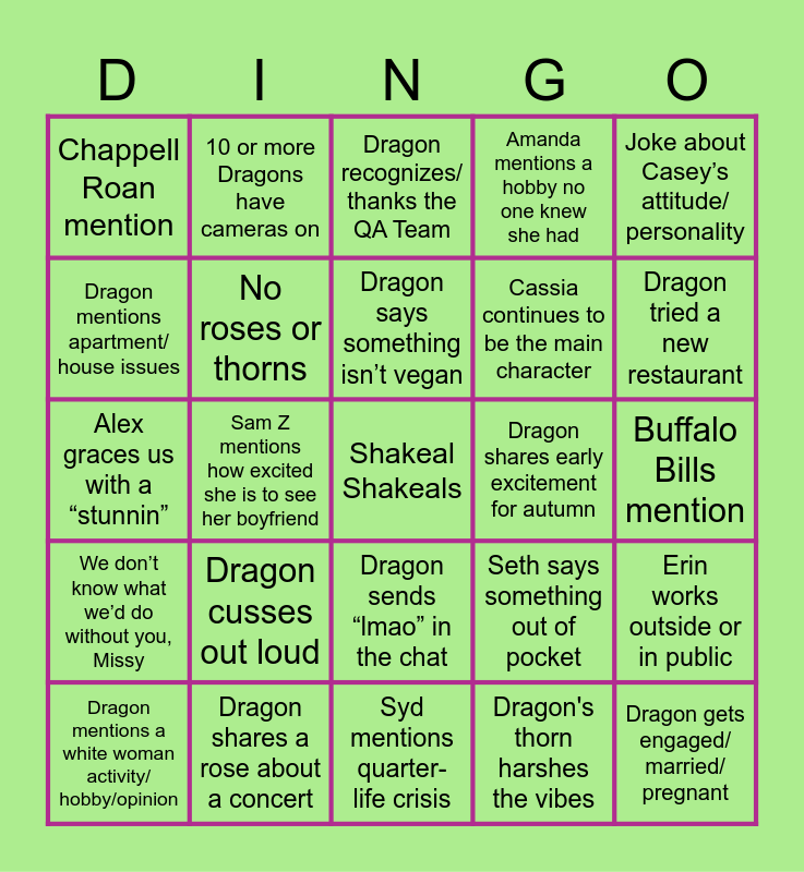 This bingo card has a free space and 24 words: Dragon cusses out loud, Dragon shares a rose about a concert, Dragon says something isn’t vegan, Dragon mentions a white woman activity/ hobby/opinion, Joke about Casey’s attitude/ personality, Chappell Roan mention, Dragon mentions apartment/ house issues, 10 or more Dragons have cameras on, Dragon shares early excitement for autumn, Dragon sends “lmao” in the chat, Cassia continues to be the main character, Alex graces us with a “stunnin”, Seth says something out of pocket, Erin works outside or in public, No roses or thorns, Dragon's thorn harshes the vibes, Buffalo Bills mention, Dragon recognizes/ thanks the QA Team, Dragon tried a new restaurant, Sam Z mentions how excited she is to see her boyfriend, Dragon gets engaged/ married/ pregnant, We don’t know what we’d do without you, Missy, Amanda mentions a hobby no one knew she had and Syd mentions quarter-life crisis.