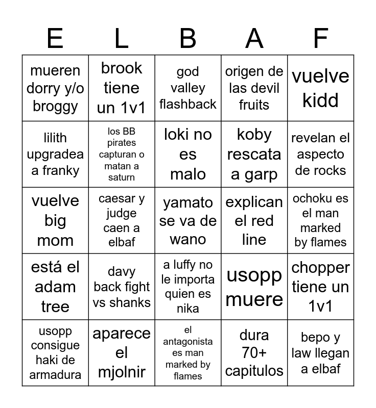 This bingo card has 25 words: davy back fight vs shanks, el antagonista es man marked by flames, loki no es malo, usopp consigue haki de armadura, vuelve kidd, mueren dorry y/o broggy, lilith upgradea a franky, brook tiene un 1v1, explican el red line, a luffy no le importa quien es nika, koby rescata a garp, vuelve big mom, usopp muere, chopper tiene un 1v1, los BB pirates capturan o matan a saturn, bepo y law llegan a elbaf, ochoku es el man marked by flames, god valley flashback, revelan el aspecto de rocks, caesar y judge caen a elbaf, yamato se va de wano, aparece el mjolnir, está el adam tree, origen de las devil fruits and dura 70+ capitulos.