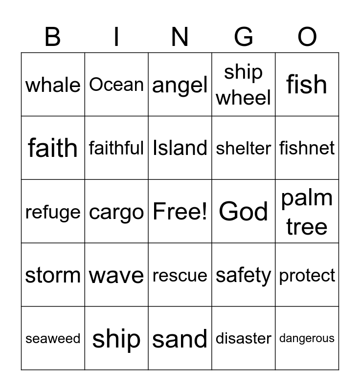 This bingo card has a free space and 24 words: wave, ship, Island, seaweed, fish, whale, faith, Ocean, God, rescue, shelter, refuge, safety, protect, faithful, disaster, palm tree, angel, fishnet, cargo, dangerous, storm, ship wheel and sand.