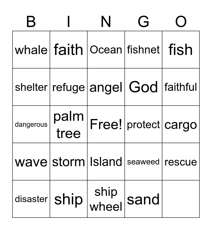 This bingo card has a free space and 24 words: wave, ship, Island, seaweed, fish, whale, faith, Ocean, God, rescue, shelter, refuge, safety, protect, faithful, disaster, palm tree, angel, fishnet, cargo, dangerous, storm, ship wheel and sand.