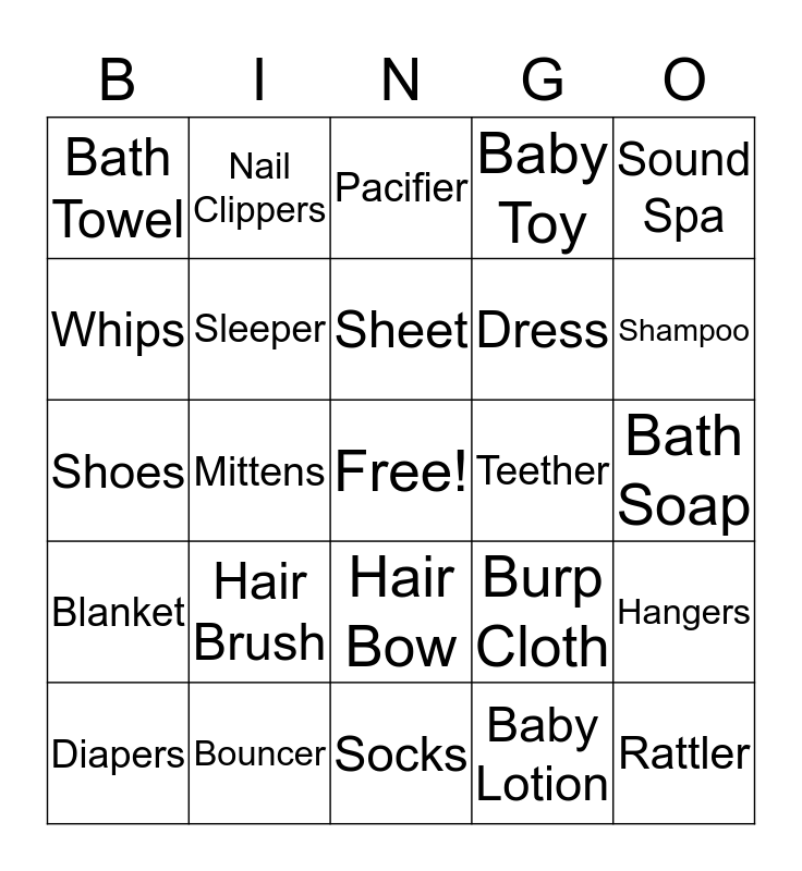 This bingo card has a free space and 24 words: Hair Brush, Bouncer, Sheet, Diapers, Sound Spa, Bath Towel, Whips, Nail Clippers, Teether, Hair Bow, Dress, Shoes, Burp Cloth, Hangers, Sleeper, Baby Lotion, Bath Soap, Pacifier, Shampoo, Mittens, Rattler, Blanket, Baby Toy and Socks.