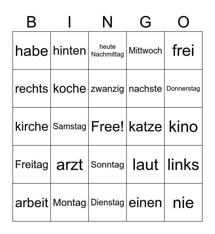 This bingo card has a free space and 24 words: arbeit, arzt, zwanzig, einen, frei, habe, hinten, heute Nachmittag, katze, kino, kirche, koche, laut, links, rechts, Montag, Dienstag, Mittwoch, Donnerstag, Freitag, Samstag, Sonntag, nachste and nie.