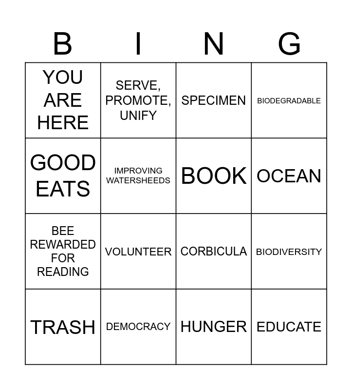 This bingo card has 30 words: Free!, DESIGN, BIODIVERSITY, BUZZ, YOU ARE HERE, SPECIMEN, BOOK, GULF OF MEXICO, DEMOCRACY, ADVENTURE, HUNGER, TRASH, THURSDAY-FRIDAY, CITY, VOLUNTEER, NETWORK, PRESERVE, EDUCATE, PRIDE, GOOD EATS, CORBICULA, GET REC'D, SERVE, PROMOTE, UNIFY, BEE REWARDED FOR READING, IMPROVING WATERSHEEDS, BIODEGRADABLE, CLIMATE, FASHION, OCEAN and PROVIDE.