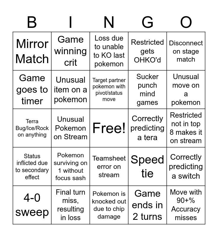 This bingo card has a free space and 24 words: Pokemon surviving on 1 without focus sash, Final turn miss, resulting in loss, Target partner pokemon with pivot/status move, 4-0 sweep, Disconnect on stage match, Mirror Match, Game goes to timer, Game winning crit, Correctly predicting a tera, Teamsheet error on stream, Sucker punch mind games, Terra Bug/Ice/Rock on anything, Speed tie, Correctly predicting a switch, Unusual item on a pokemon, Game ends in 2 turns, Restricted not in top 8 makes it on stream, Loss due to unable to KO last pokemon, Unusual move on a pokemon, Unusual Pokemon on Stream, Move with 90+% Accuracy misses, Status inflicted due to secondary effect, Restricted gets OHKO'd and Pokemon is knocked out due to chip damage.