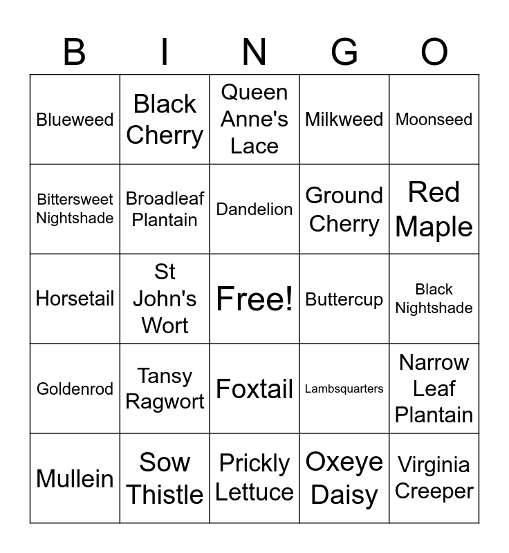 This bingo card has a free space and 24 words: Tansy Ragwort, Sow Thistle, Dandelion, Mullein, Moonseed, Blueweed, Bittersweet Nightshade, Black Cherry, Buttercup, Foxtail, Ground Cherry, Horsetail, Lambsquarters, Narrow Leaf Plantain, Broadleaf Plantain, Oxeye Daisy, Black Nightshade, Queen Anne's Lace, Red Maple, St John's Wort, Virginia Creeper, Goldenrod, Milkweed and Prickly Lettuce.