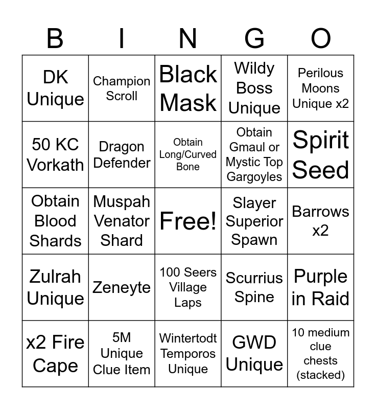 This bingo card has a free space and 24 words: Zeneyte, 5M Unique Clue Item, Obtain Long/Curved Bone, x2 Fire Cape, Perilous Moons Unique x2, DK Unique, 50 KC Vorkath, Champion Scroll, Slayer Superior Spawn, 100 Seers Village Laps, Obtain Gmaul or Mystic Top Gargoyles, Obtain Blood Shards, Scurrius Spine, Purple in Raid, Dragon Defender, GWD Unique, Barrows x2, Black Mask, Spirit Seed, Muspah Venator Shard, 10 medium clue chests (stacked), Zulrah Unique, Wildy Boss Unique and Wintertodt Temporos Unique.