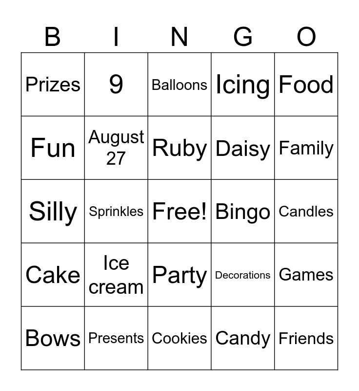 This bingo card has a free space and 24 words: Ice cream, Presents, Ruby, Bows, Food, Prizes, Fun, 9, Bingo, Party, Daisy, Silly, Decorations, Games, August 27, Candy, Candles, Balloons, Family, Sprinkles, Friends, Cake, Icing and Cookies.