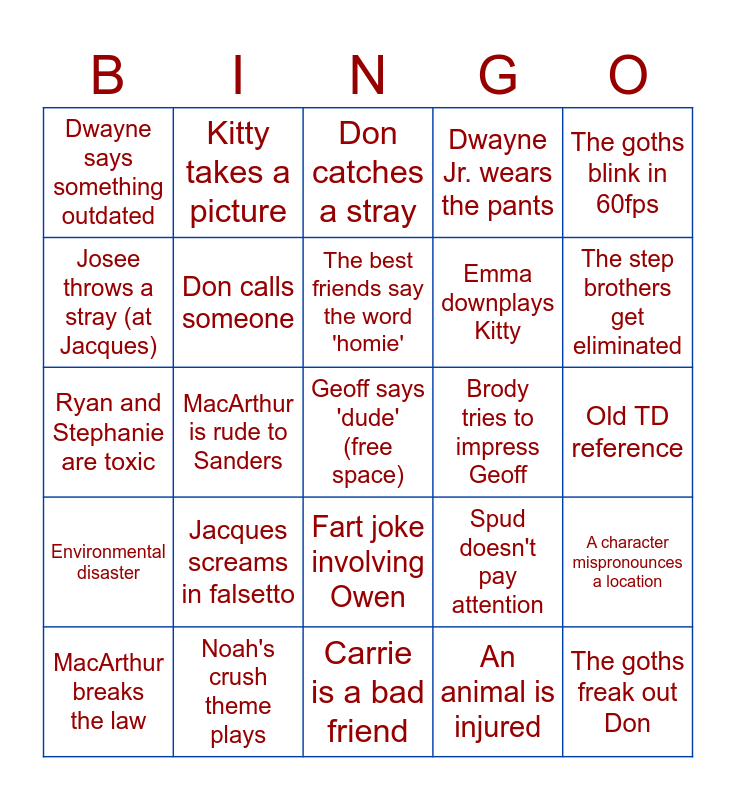This bingo card has a free space and 24 words: Jacques screams in falsetto, Noah's crush theme plays, The best friends say the word 'homie', MacArthur breaks the law, The goths blink in 60fps, Dwayne says something outdated, Josee throws a stray (at Jacques), Kitty takes a picture, Brody tries to impress Geoff, Fart joke involving Owen, Emma downplays Kitty, Ryan and Stephanie are toxic, Spud doesn't pay attention, A character mispronounces a location, Don calls someone, An animal is injured, Old TD reference, Don catches a stray, The step brothers get eliminated, MacArthur is rude to Sanders, The goths freak out Don, Environmental disaster, Dwayne Jr. wears the pants and Carrie is a bad friend.