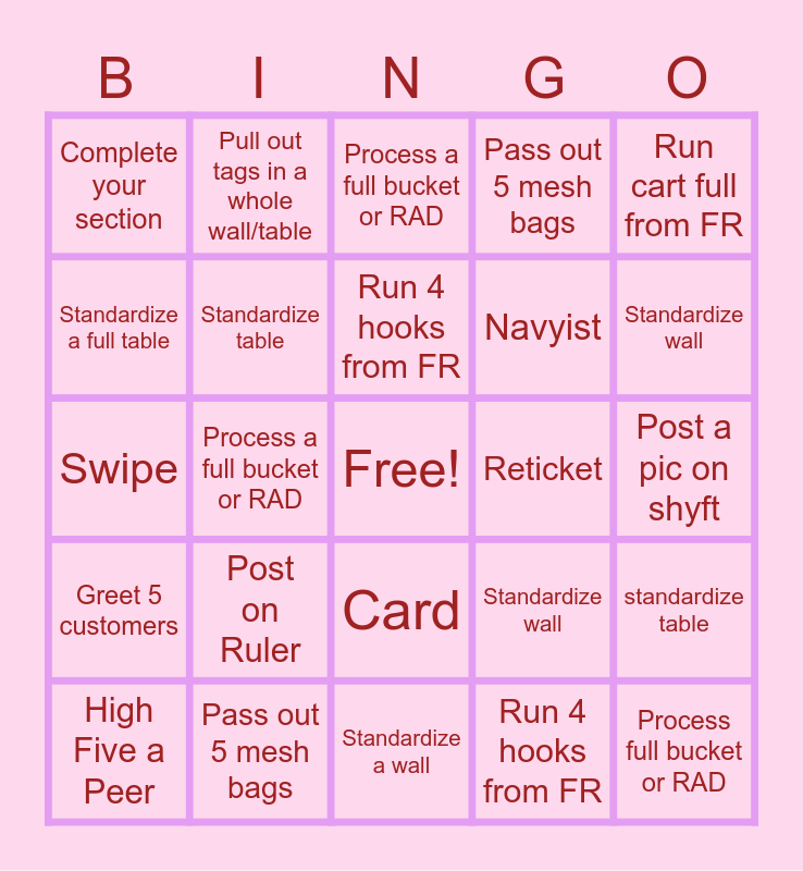 This bingo card has a free space and 25 words: Post on Ruler, Standardize a wall, Run 4 hooks from FR, High Five a Peer, Run cart full from FR, Complete your section, Standardize a full table, Pull out tags in a whole wall/table, Reticket, Card, Navyist, Swipe, Standardize wall, standardize table, Standardize table, Run From FR, Post a pic on shyft, Process a full bucket or RAD, Standardize wall, Process a full bucket or RAD, Process full bucket or RAD, Pass out 5 mesh bags, Greet 5 customers, Pass out 5 mesh bags and Run 4 hooks from FR.