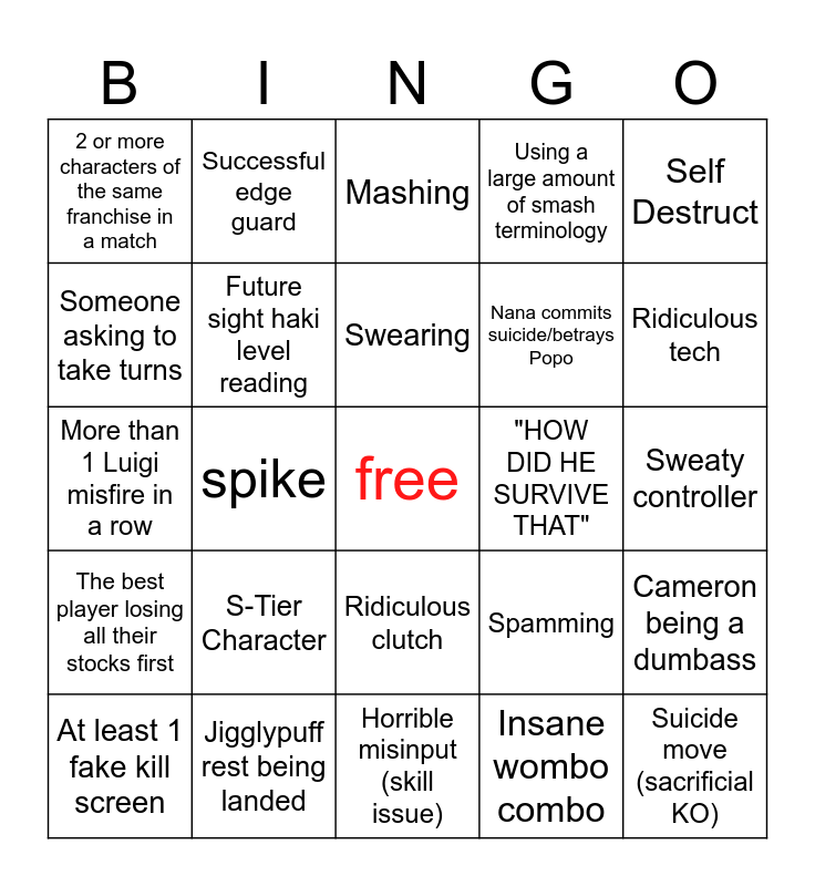 This bingo card has a free space and 24 words: S-Tier Character, Jigglypuff rest being landed, Swearing, At least 1 fake kill screen, Self Destruct, 2 or more characters of the same franchise in a match, Someone asking to take turns, Successful edge guard, "HOW DID HE SURVIVE THAT", Ridiculous clutch, Nana commits suicide/betrays Popo, More than 1 Luigi misfire in a row, Spamming, Cameron being a dumbass, Future sight haki level reading, Insane wombo combo, Sweaty controller, Mashing, Ridiculous tech, spike, Suicide move (sacrificial KO), The best player losing all their stocks first, Using a large amount of smash terminology and Horrible misinput (skill issue).