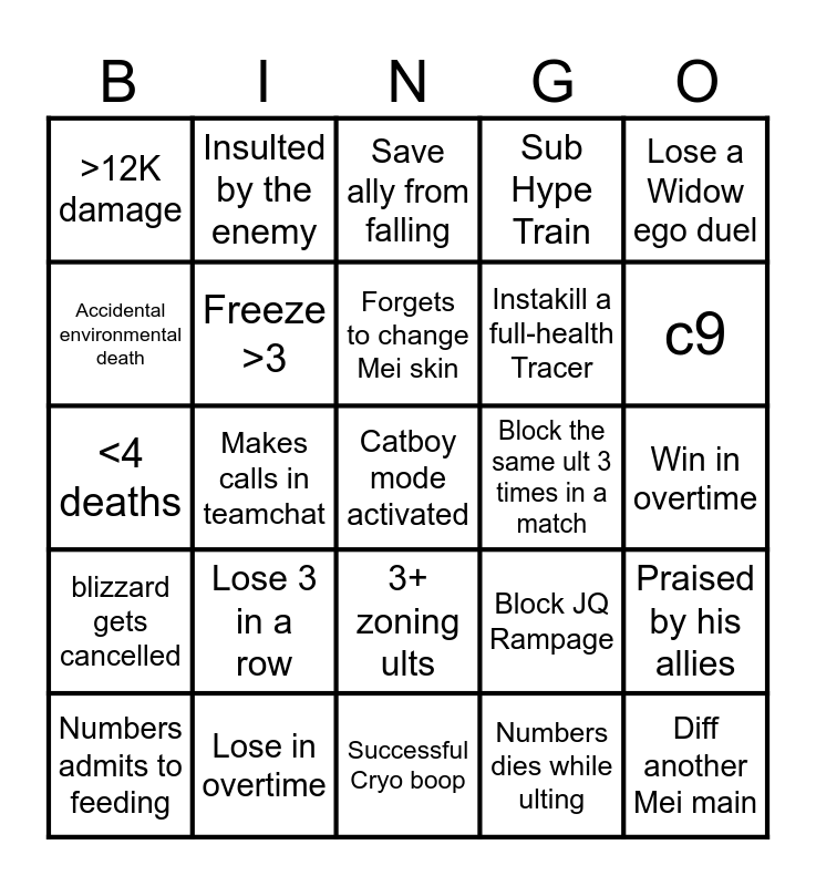 This bingo card has a free space and 29 words: Numbers admits to feeding, >100 viewers, Makes calls in teamchat, Block Rein Shatter, >12K damage, Save ally from falling, Freeze >3, Lose 3 in a row, Block the same ult 3 times in a match, Lose in overtime, Win in overtime, Diff another Mei main, Successful Cryo boop, Numbers dies while ulting, c9, Win 3 in a row, 3+ zoning ults, blizzard gets cancelled, Lose a Widow ego duel, <4 deaths, Block JQ Rampage, Numbers has to swap, Instakill a full-health Tracer, Accidental environmental death, Sub Hype Train, Insulted by the enemy, Praised by his allies, Forgets to change Mei skin and Sleeping through Blizzard.