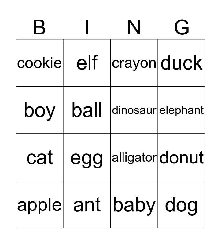 This bingo card has a free space and 15 words: apple, dog, crayon, cookie, elephant, boy, egg, baby, ball, cat, donut, duck, dinosaur, elf and ant.