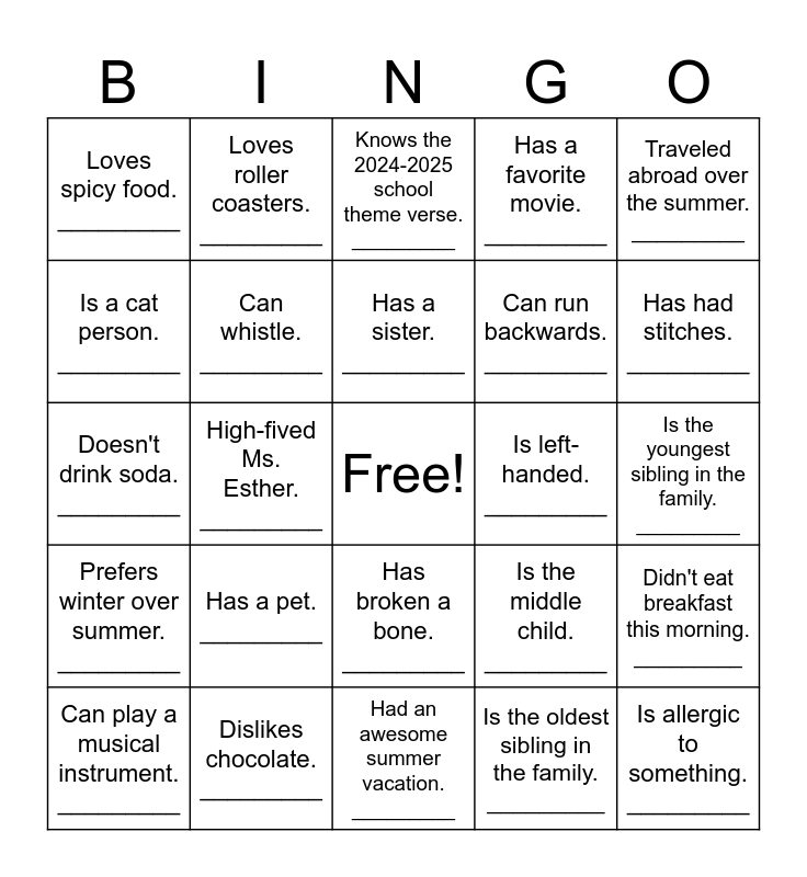 This bingo card has a free space and 24 words: Has a pet. _________, Dislikes chocolate. _________, Has a sister. _________, Can play a musical instrument. _________, Traveled abroad over the summer. _________, Loves spicy food. _________, Is a cat person. _________, Loves roller coasters. _________, Is left-handed. _________, Has broken a bone. _________, Can run backwards. _________, Doesn't drink soda. _________, Is the middle child. _________, Didn't eat breakfast this morning. _________, Can whistle. _________, Is the oldest sibling in the family. _________, Is the youngest sibling in the family. _________, Knows the 2024-2025 school theme verse. _________, Has had stitches. _________, High-fived Ms. Esther. _________, Is allergic to something. _________, Prefers winter over summer. _________, Has a favorite movie. _________ and Had an awesome summer vacation. _________.