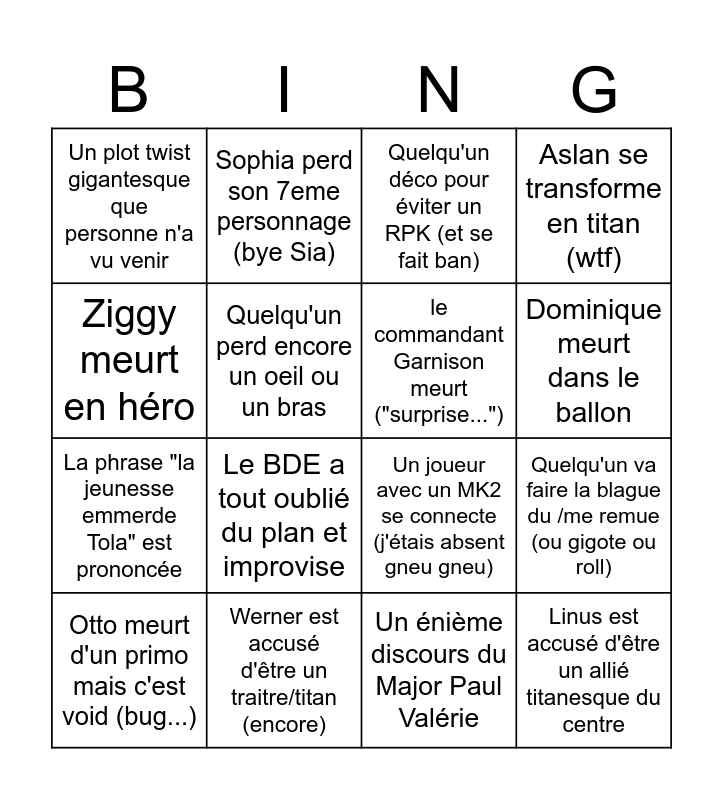 This bingo card has 16 words: Werner est accusé d'être un traitre/titan (encore), Quelqu'un va faire la blague du /me remue (ou gigote ou roll), Quelqu'un déco pour éviter un RPK (et se fait ban), Un plot twist gigantesque que personne n'a vu venir, La phrase "la jeunesse emmerde Tola" est prononcée, Sophia perd son 7eme personnage (bye Sia), Un joueur avec un MK2 se connecte (j'étais absent gneu gneu), Un énième discours du Major Paul Valérie, Ziggy meurt en héro, Quelqu'un perd encore un oeil ou un bras, Otto meurt d'un primo mais c'est void (bug...), Aslan se transforme en titan (wtf), Le BDE a tout oublié du plan et improvise, Dominique meurt dans le ballon, le commandant Garnison meurt ("surprise...") and Linus est accusé d'être un allié titanesque du centre.