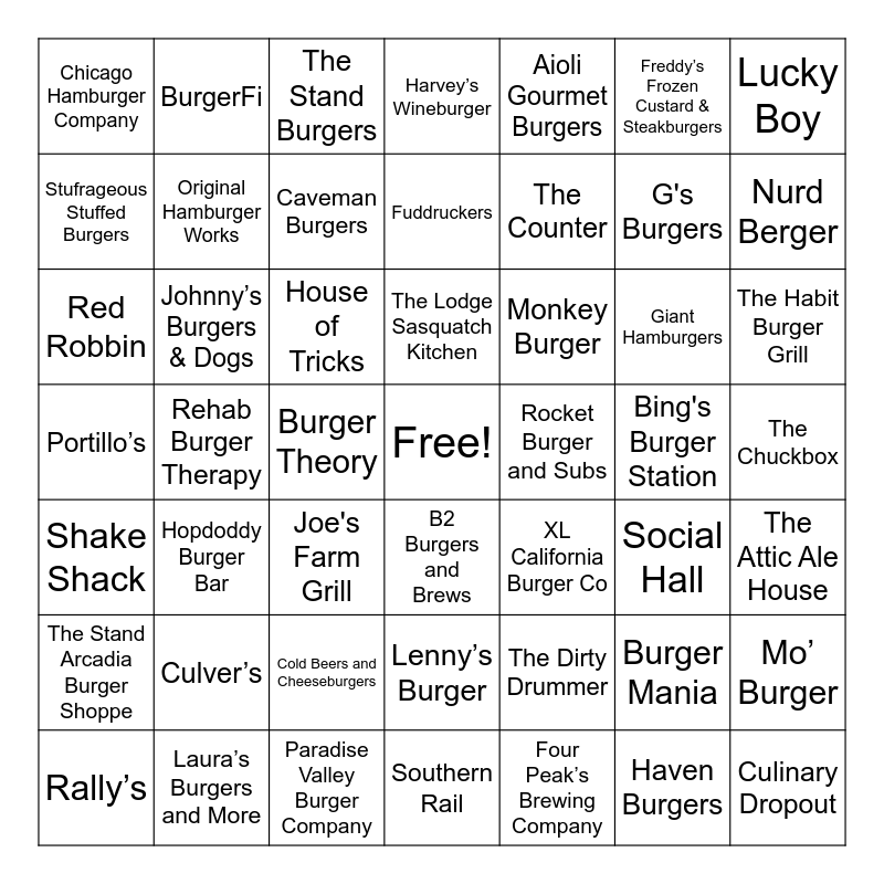This bingo card has a free space and 57 words: Smashburger, The Habit Burger Grill, In-N-Out Burger, Chicago Hamburger Company, Rehab Burger Therapy, Lenny’s Burger, Lucky Boy, Five Guys, Original Hamburger Works, The Dirty Drummer, Harvey’s Wineburger, The Stand Arcadia Burger Shoppe, Shake Shack, The Chuckbox, Paradise Valley Burger Company, Hopdoddy Burger Bar, Aioli Gourmet Burgers, The Counter, Zinburger Wine & Burger Bar, G's Burgers, Nurd Berger, Joe's Farm Grill, Monkey Burger, The Stand Burgers, Detroit Coney Grill, Stufrageous Stuffed Burgers, Bing's Burger Station, Delux Burger, Caveman Burgers, B2 Burgers and Brews, Arizona Wilderness Brewing Co., The Attic Ale House, Laura’s Burgers and More, Southern Rail, Red Robbin, Freddy’s Frozen Custard & Steakburgers, Culver’s, Fuddruckers, Cold Beers and Cheeseburgers, Johnny’s Burgers & Dogs, BurgerFi, The Lodge Sasquatch Kitchen, Culinary Dropout, Americana Tempe, Mo’ Burger, Rally’s, House of Tricks, Portillo’s, Four Peak’s Brewing Company, Social Hall, Rocket Burger and Subs, Burger Theory, XL California Burger Co, Burger Mania, Haven Burgers, Giant Hamburgers and BurgerIM.