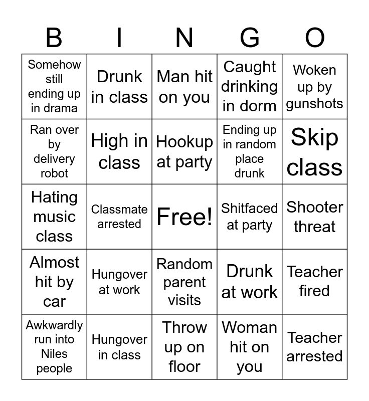 This bingo card has a free space and 24 words: Awkwardly run into Niles people, Hungover at work, Hookup at party, Woman hit on you, Woken up by gunshots, Somehow still ending up in drama, Drunk in class, Man hit on you, Shitfaced at party, Shooter threat, Hating music class, High in class, Drunk at work, Teacher fired, Ran over by delivery robot, Hungover in class, Throw up on floor, Caught drinking in dorm, Skip class, Almost hit by car, Classmate arrested, Random parent visits, Ending up in random place drunk and Teacher arrested.