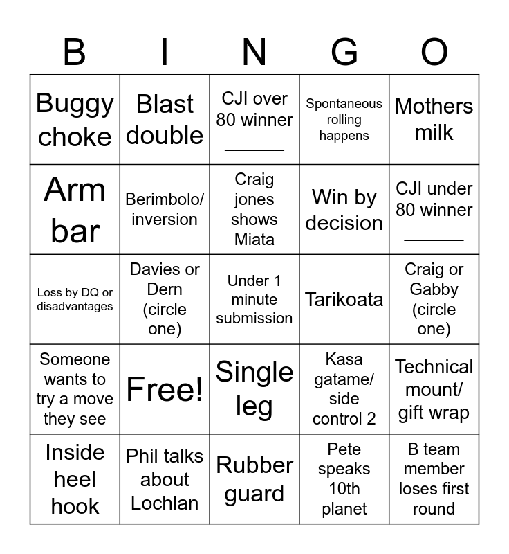 This bingo card has a free space and 25 words: Free!, Rubber guard, Craig jones shows Miata, Inside heel hook, Mothers milk, Buggy choke, Arm bar, Blast double, Tarikoata, Single leg, Win by decision, Loss by DQ or disadvantages, Kasa gatame/ side control 2, Technical mount/ gift wrap, Berimbolo/ inversion, Gordon wins both super fights, Craig or Gabby (circle one), CJI over 80 winner ______, CJI under 80 winner ______, Davies or Dern (circle one), B team member loses first round, Phil talks about Lochlan, Someone wants to try a move they see, Spontaneous rolling happens and Pete speaks 10th planet.