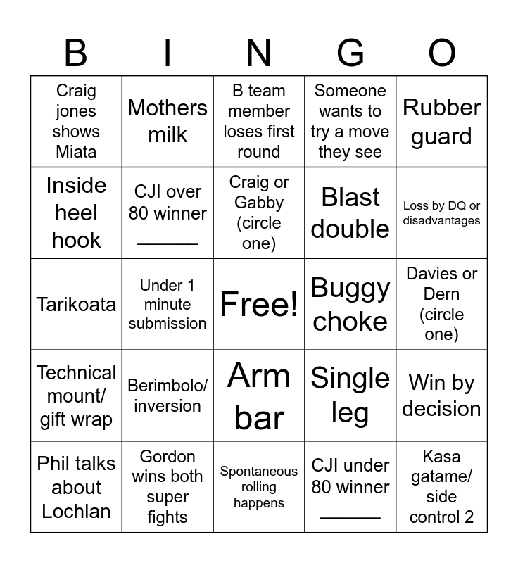 This bingo card has a free space and 24 words: Berimbolo/ inversion, Gordon wins both super fights, Craig or Gabby (circle one), Phil talks about Lochlan, Rubber guard, Craig jones shows Miata, Inside heel hook, Mothers milk, Buggy choke, Arm bar, Blast double, Tarikoata, Single leg, Win by decision, CJI over 80 winner ______, CJI under 80 winner ______, Davies or Dern (circle one), B team member loses first round, Loss by DQ or disadvantages, Under 1 minute submission, Kasa gatame/ side control 2, Technical mount/ gift wrap, Someone wants to try a move they see and Spontaneous rolling happens.