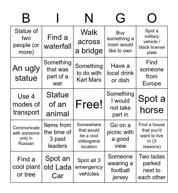 This bingo card has a free space and 30 words: Spot an old Lada Car, Shop for an outfit, Statue of an animal, Statue of someone with an animal, Statue of two people (or more), Walk across a bridge, Something that was part of a war, Somewhere that would be a cool videogame location, Something I would not take part in, Spot all 3 emergency vehicles, Spot a horse, Two ladas parked next to each other, Someone wearing a football jersey, Anything on fire, Find someone from Europe, Spot livestock, Go on a picnic with a good view, Communicate with someone only in Russian, Items from the time of 3 past leaders, Spot a military vehicle / black license plate, Use 4 modes of transport, Impressive street performer, Find a waterfall, Have a local drink or dish, An ugly statue, Buy something a mom would like to own, Find a house that you'd want to live in (3 reasons), Find a cool plant or tree, Something to do with Karl Marx and Something red outside of Red Square.
