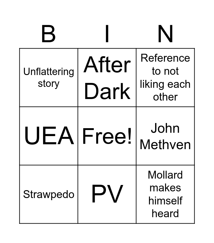 This bingo card has a free space and 16 words: Simpsons quote, Harry Potter quote, Reference to not liking each other, Unflattering story, Zoidberg, After Dark, Walkabout, More references by Leo of Jon than Hannah, Mollard makes himself heard, John Methven, Tequila, UEA, 3+ toasts, PV, Strawpedo and Reference to the weather.