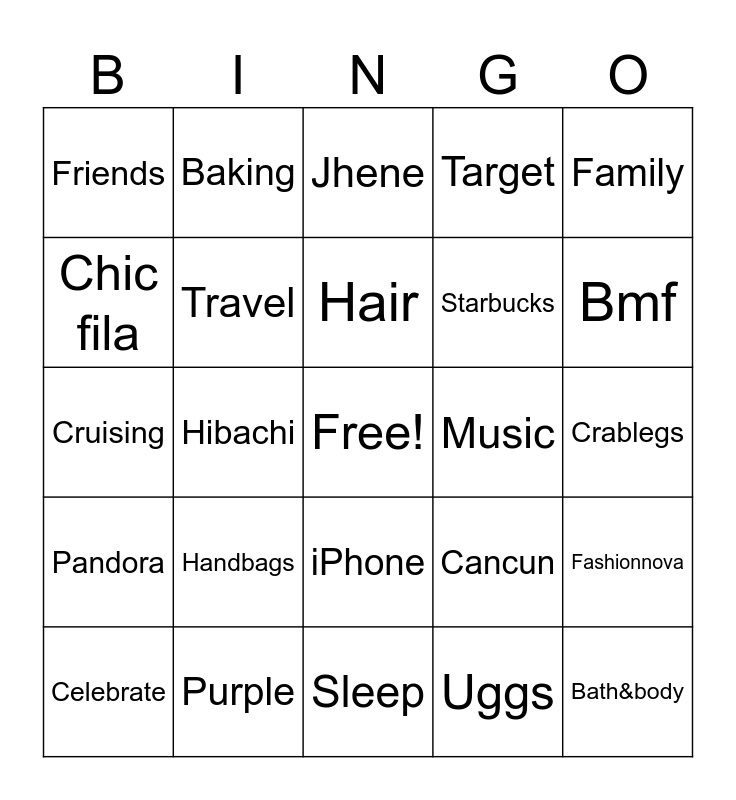 This bingo card has a free space and 33 words: Virgo, Beyonce, Hibachi, September, Pandora, Travel, Family, Celebrate, Baking, Nike, Hair, Jhene, Wnba, Volunteer, Music, Bmf, Purple, Cruising, Handbags, Cancun, iPhone, Ipad, Friends, Crablegs, Sleep, Bath&body, Target, Starbucks, Chic fila, Fashionnova, Shein, Uggs and Jordans.