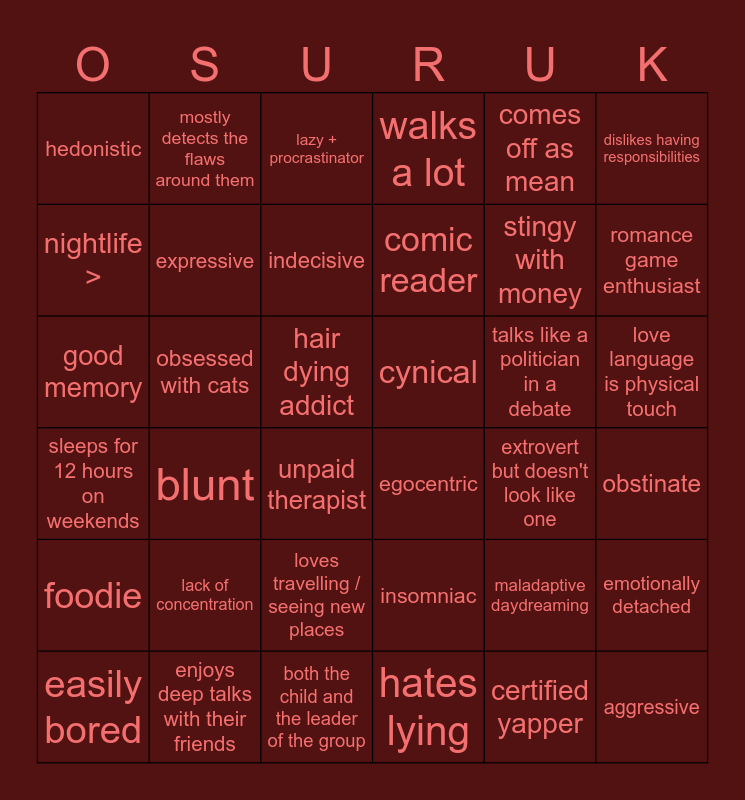 This bingo card has 36 words: insomniac, loves travelling / seeing new places, hates lying, nightlife >, sleeps for 12 hours on weekends, cynical, expressive, both the child and the leader of the group, comes off as mean, maladaptive daydreaming, romance game enthusiast, walks a lot, emotionally detached, obsessed with cats, comic reader, hedonistic, foodie, talks like a politician in a debate, good memory, lazy + procrastinator, hair dying addict, blunt, egocentric, unpaid therapist, extrovert but doesn't look like one, mostly detects the flaws around them, stingy with money, enjoys deep talks with their friends, indecisive, dislikes having responsibilities, aggressive, easily bored, obstinate, love language is physical touch, lack of concentration and certified yapper.