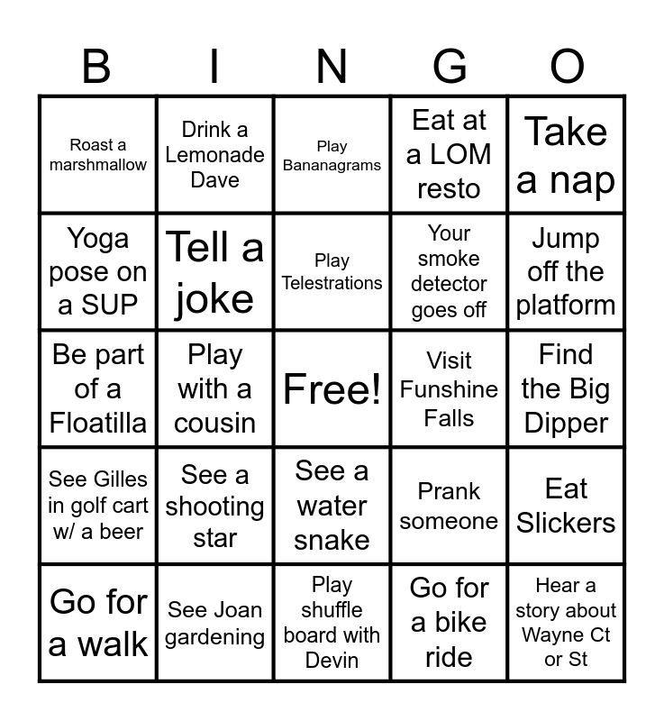 This bingo card has a free space and 28 words: Eat Slickers, Hear a loon, Your smoke detector goes off, Go for a bike ride, Yoga pose on a SUP, Play Bananagrams, Drink a Lemonade Dave, See Gilles in golf cart w/ a beer, Visit Funshine Falls, Go for a walk, Be part of a Floatilla, Eat at a LOM resto, See Joan gardening, Play shuffle board with Devin, Jump off the platform, Catch a fish or minnow, See a shooting star, Tell a joke, Play Telestrations, See a water snake, Roast a marshmallow, Kayak, Hear a story about Wayne Ct or St, Play with a cousin, Find the Big Dipper, Prank someone, Take a nap and Read a book.