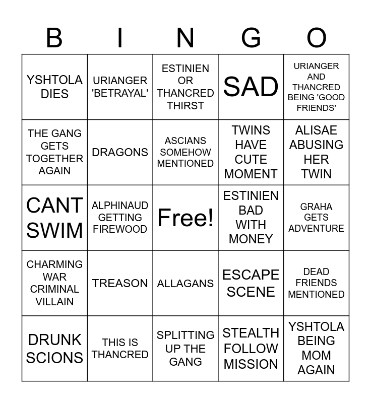 This bingo card has a free space and 24 words: TREASON, THIS IS THANCRED, ASCIANS SOMEHOW MENTIONED, DRUNK SCIONS, URIANGER AND THANCRED BEING 'GOOD FRIENDS', YSHTOLA DIES, THE GANG GETS TOGETHER AGAIN, URIANGER 'BETRAYAL', ESTINIEN BAD WITH MONEY, ALLAGANS, TWINS HAVE CUTE MOMENT, CANT SWIM, ESCAPE SCENE, DEAD FRIENDS MENTIONED, DRAGONS, STEALTH FOLLOW MISSION, GRAHA GETS ADVENTURE, ESTINIEN OR THANCRED THIRST, ALISAE ABUSING HER TWIN, ALPHINAUD GETTING FIREWOOD, YSHTOLA BEING MOM AGAIN, CHARMING WAR CRIMINAL VILLAIN, SAD and SPLITTING UP THE GANG.