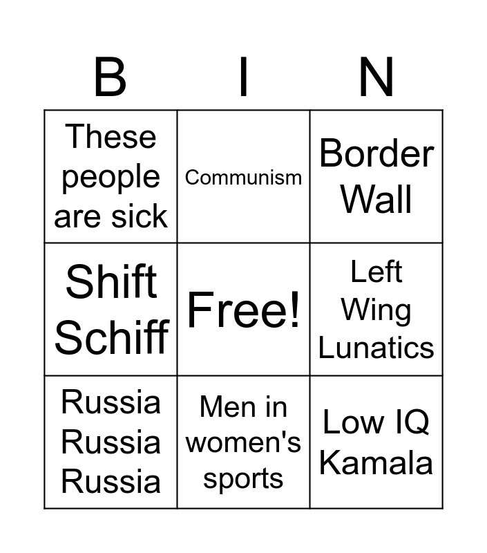 This bingo card has a free space and 8 words: Left Wing Lunatics, Border Wall, Communism, Russia Russia Russia, These people are sick, Low IQ Kamala, Shift Schiff and Men in women's sports.