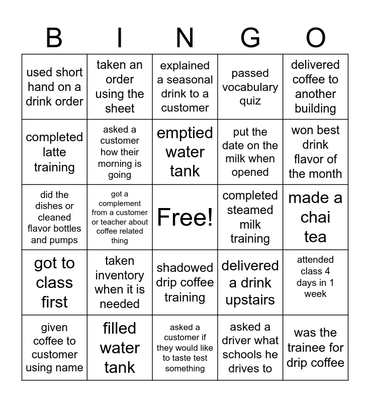 This bingo card has a free space and 24 words: taken inventory when it is needed, filled water tank, emptied water tank, given coffee to customer using name, delivered coffee to another building, used short hand on a drink order, completed latte training, taken an order using the sheet, completed steamed milk training, shadowed drip coffee training, put the date on the milk when opened, did the dishes or cleaned flavor bottles and pumps, delivered a drink upstairs, attended class 4 days in 1 week, asked a customer how their morning is going, asked a driver what schools he drives to, made a chai tea, explained a seasonal drink to a customer, won best drink flavor of the month, got a complement from a customer or teacher about coffee related thing, was the trainee for drip coffee, got to class first, passed vocabulary quiz and asked a customer if they would like to taste test something.