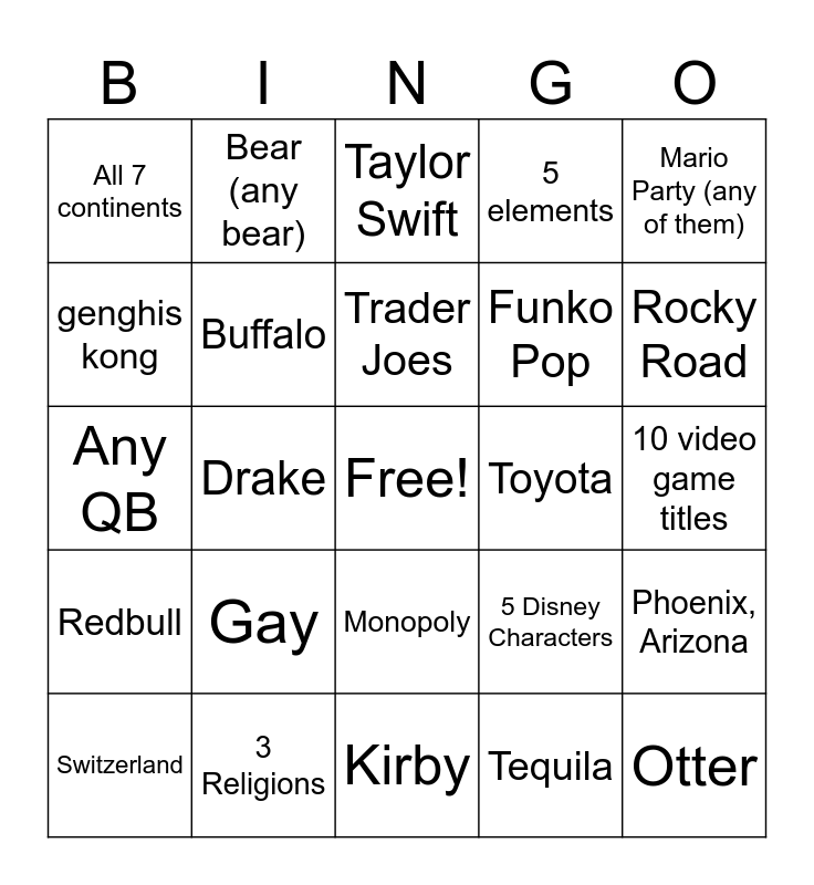 This bingo card has a free space and 24 words: Gay, 3 Religions, Trader Joes, Switzerland, Mario Party (any of them), All 7 continents, genghis kong, Bear (any bear), Toyota, Monopoly, Funko Pop, Any QB, 5 Disney Characters, Phoenix, Arizona, Buffalo, Tequila, 10 video game titles, Taylor Swift, Rocky Road, Drake, Otter, Redbull, 5 elements and Kirby.