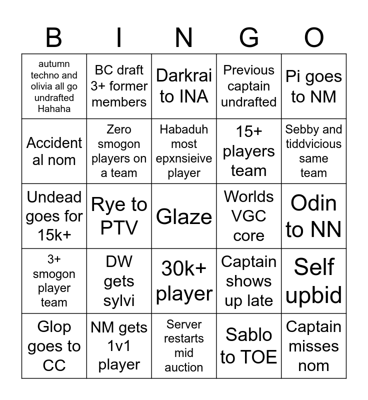 This bingo card has a free space and 24 words: DW gets sylvi, NM gets 1v1 player, Habaduh most epxnsieive player, Glop goes to CC, Pi goes to NM, autumn techno and olivia all go undrafted Hahaha, Accident al nom, BC draft 3+ former members, Worlds VGC core, 30k+ player, 15+ players team, Undead goes for 15k+, Captain shows up late, Self upbid, Zero smogon players on a team, Sablo to TOE, Odin to NN, Darkrai to INA, Sebby and tiddvicious same team, Rye to PTV, Captain misses nom, 3+ smogon player team, Previous captain undrafted and Server restarts mid auction.