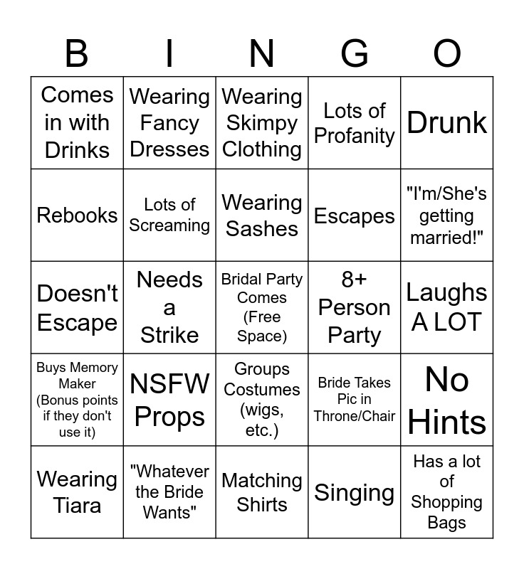 This bingo card has a free space and 25 words: NSFW Props, Matching Shirts, Wearing Sashes, Wearing Tiara, Drunk, Comes in with Drinks, Rebooks, Wearing Fancy Dresses, 8+ Person Party, Groups Costumes (wigs, etc.), Escapes, Doesn't Escape, Bride Takes Pic in Throne/Chair, No Hints, Lots of Screaming, Inappropriate Jokes, Laughs A LOT, Wearing Skimpy Clothing, "I'm/She's getting married!", Needs a Strike, Has a lot of Shopping Bags, "Whatever the Bride Wants", Buys Memory Maker (Bonus points if they don't use it), Lots of Profanity and Singing.