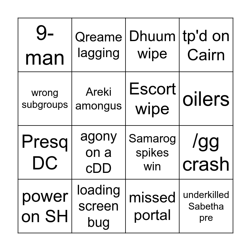 This bingo card has 16 words: loading screen bug, /gg crash, Dhuum wipe, 9-man, Presq DC, Qreame lagging, Samarog spikes win, missed portal, wrong subgroups, Areki amongus, power on SH, tp'd on Cairn, agony on a cDD, oilers, Escort wipe and underkilled Sabetha pre.