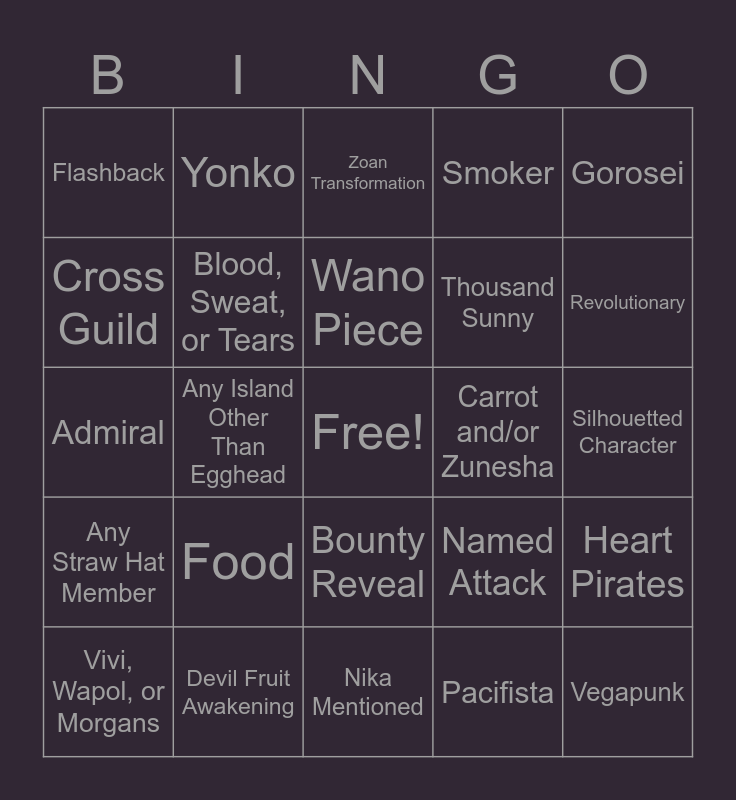 This bingo card has a free space and 29 words: Vivi, Wapol, or Morgans, Kid Pirates, Any Island Other Than Egghead, New Named Devil Fruit, Flashback, Zoan Transformation, Blood, Sweat, or Tears, Food, Carrot and/or Zunesha, Devil Fruit Awakening, Silhouetted Character, Vegapunk, Nika Mentioned, Pacifista, Revolutionary, Joy Boy Mentioned, Bounty Reveal, Any Straw Hat Member, Gorosei, Admiral, Named Attack, Seraphim, Thousand Sunny, Cross Guild, Smoker, Yonko, Heart Pirates, Wano Piece and Cipher Pol.