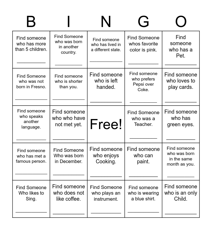 This bingo card has a free space and 25 words: Find Someone Who was born in December. ____________, Find Someone who plays an instrument. ___________, Find someone who is left handed. ___________, Find Someone Who likes to Sing. ____________, Find someone who has a Pet. ___________, Find someone who has more than 5 children. ___________, Find Someone who was not born in Fresno. _____________, Find Someone who was born in another country. ___________, Find Someone who was a Teacher. __________, Find someone who enjoys Cooking. ___________, Find someone who prefers Pepsi over Coke. ___________, Find someone who speaks another language. ____________, Find someone who can paint. __________, Find someone who was born in the same month as you. ___________, Find someone who is shorter than you. _____________, Find someone who has been on a cruise. ___________, Find someone who has green eyes. __________, Find someone who has lived in a different state. ______________, Find someone who loves to play cards. ___________, Find someone who who have not met yet. ___________, Find someone who is an only Child. ___________, Find someone who does not like coffee. ___________, Find someone who has met a famous person. _____________, Find Someone whos favorite color is pink. ___________ and Find someone who is wearing a blue shirt. ____________.